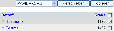 In diesem Fall wird die erste Nachrichten in den Ordner "Papierkorb" verschoben. Das Dropdownmenü erlaubt die Auswahl jedes Ordners, der vorhanden ist. (siehe Anlegen eines Ordners um zu lernen, wie man eigene Ordner bearbeitet).